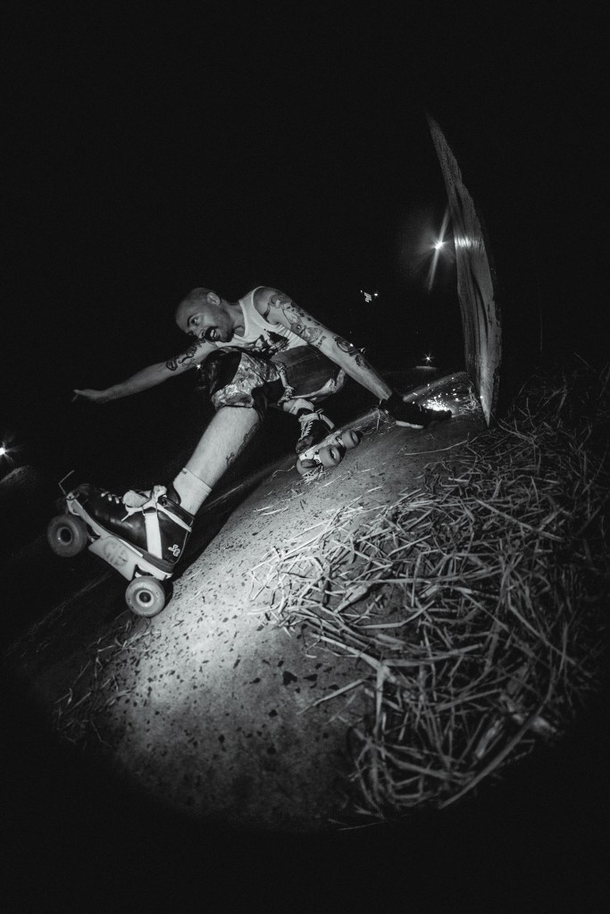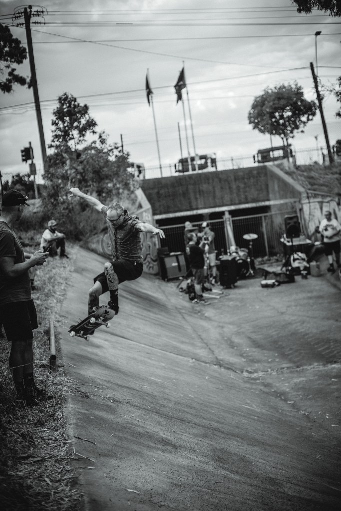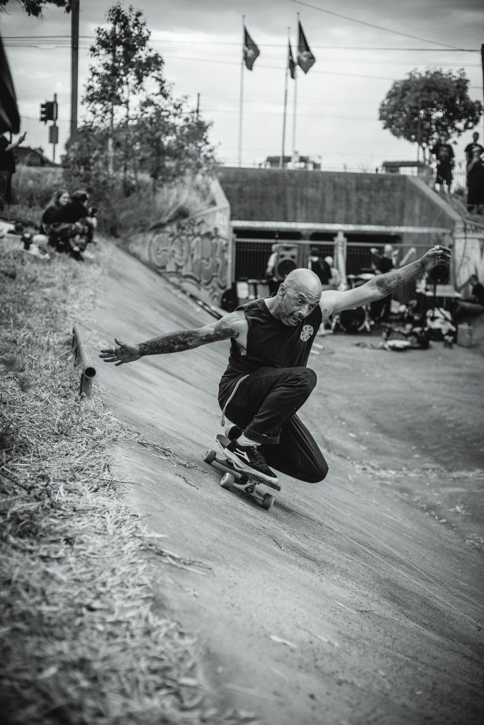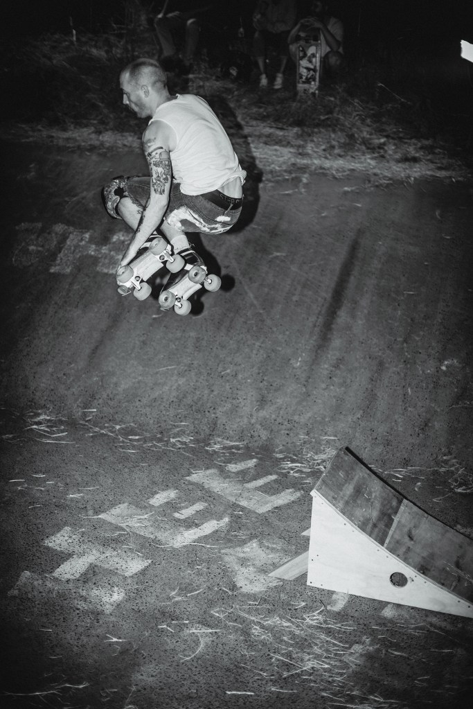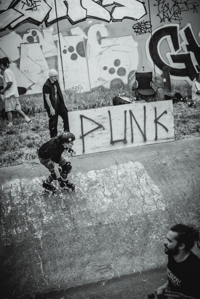 The sounds of hard urethane sliding on rough-aged concrete heralded our arrival as skater after skater raced down a steep concrete path before dropping into the Springvale Drains and carving up the walls of this well-loved skate spot. Punk band, Fun Again provided the soundtrack that kicked off Bank Rock 2023 as the crowd gathered round to hear some good tunes and watch their friend’s skate this mad ditch. Skateboarders and roller skaters alike took on the make-shift wall ride and grind rails that had been added to the drains for the day. It was just freaking cool! We spoke to one of Bank Rock’s organisers, Noel Forsyth to get the low down on how the event came about and why it’s so special.