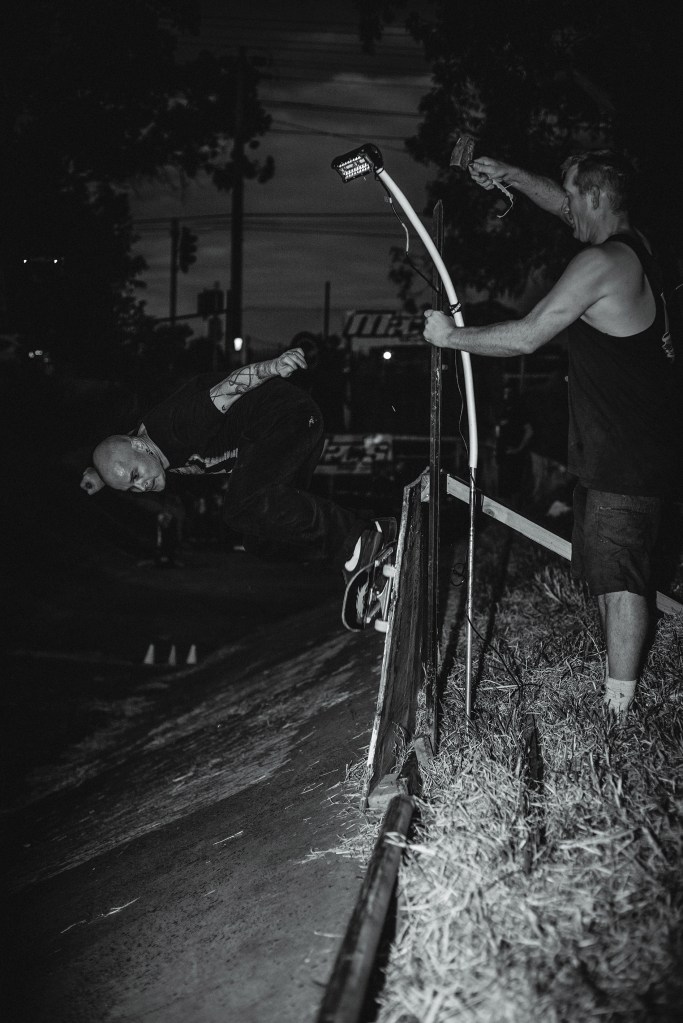 The Bank Rock thing grew out of the timed bank slalom races which happened 3 – 4 times a year at Springy Ditch from 2005 – 2016. I loved the speed rush but was frustrated I’d only get half a dozen runs each time. We’d been running a generator and lights at skate sessions for over a decade, and I always wanted a great mix of ripping punker tunes to skate to. I daydreamed of how cool it would be to have a band playing in front of the drain and made a few enquiries. It took some work on my part, but was pretty straightforward to pull together. We did the first one in 2019 and it was hugely popular – and we only had 70 or 80 people there.