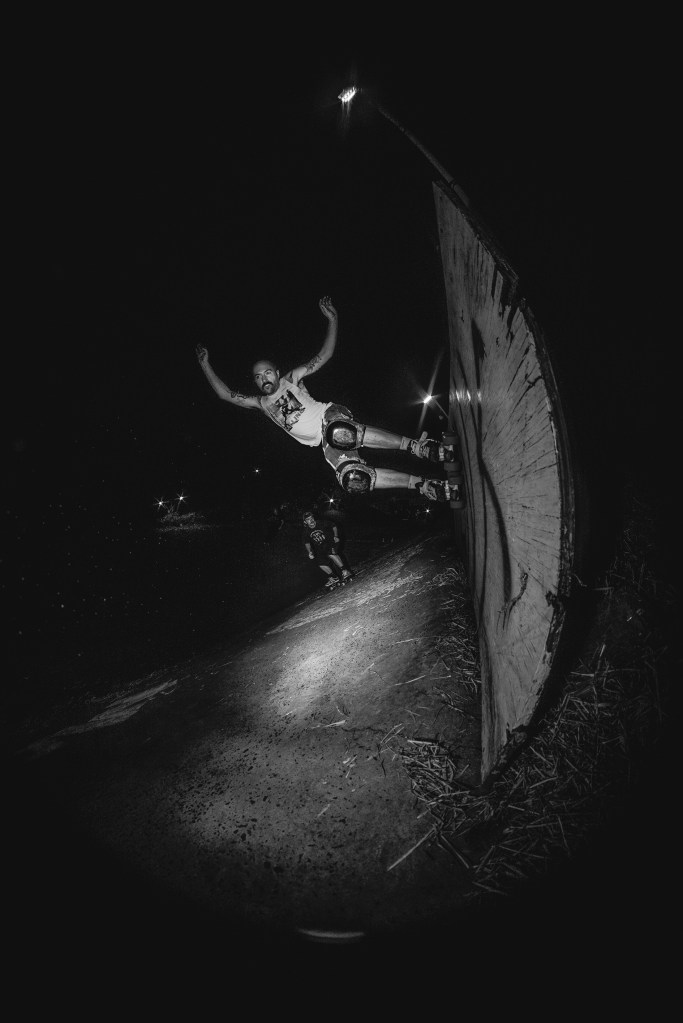 In 2002/3, when I had young kids, I came as close as ever to actually stopping skating. Work was intense, I was tired, and I just couldn’t really find the time. My mates hounded me to come and roll at some of the new bowls, but it came as a bit of a shock that I wasn’t hacking it. My legs were mush and I’d been away from it long enough that I was pretty crap, but it’s in your blood somewhere though, and soon enough it all started to click again. As I got stronger, I realised it was something I’d really missed. The rush of high-speed bowl riding is kind of like what you get on a water slide maybe, except you’re in complete control. It’s addictive, much like surfing, but way more accessible for a Melbournite. Plus, my skate friends are just an amazing bunch of positive guys. We’d almost qualify as a sports club, but there’s no President, no weekly training, no rules.