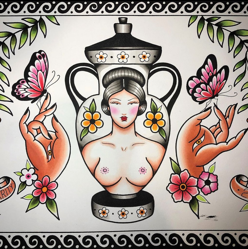 When I first started getting tattooed a long time ago in a galaxy far, far away getting tattooed was still considered taboo, and so finding a really talented tattoo artist was a challenge. We didn’t have the Internet back then – yes, it was literally the Stone Age! But now, with the likes of Instagram it’s so much easier to find a super amazing tattooist, like the wonderful Clare Hampshire! Bold lines, bold colours and an artists touch allow Clare to bring your skin to life with pets, panthers, pin-ups and anything else you can think of! I’ve been a fan of Clare’s tattooing and artwork for years now and so I was stoked to have a quick chat to the gal about how it all began and where it’s going …